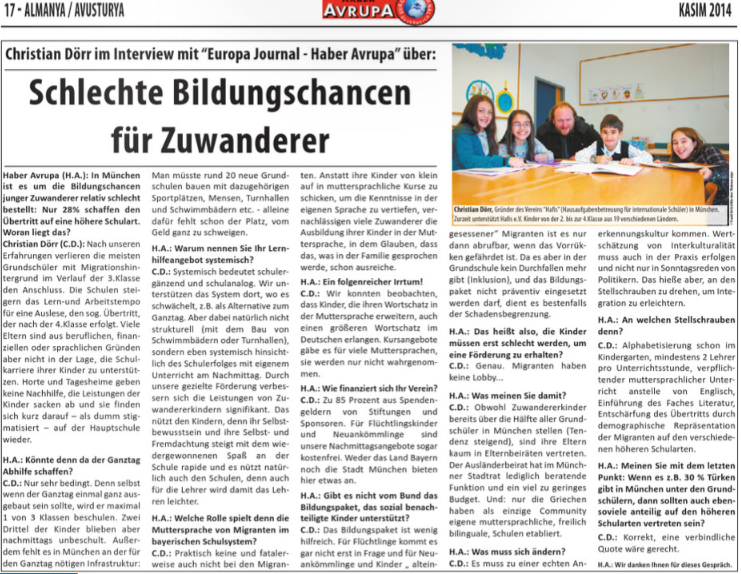 Neuhausen/Nymphenburg - Kinder aus allen Gesellschaftsschichten sollten einen gleichberechtigten Zugang zur Bildung haben - so ungefähr lautet das Motto von Hafis e.V.. Der Verein ist nicht nur in Neuhausen an der Grundschule am Winthirplatz sondern auch im Hasenbergl an den Grundschulen an der Ittlinger - und Eduard-Spranger-Straße als freier Träger der Jugendhilfe tätig. " Hafis" ist die Abkürzung für "Hausaufgabenbetreuung für internationale Schüler ". Den Verein hat Christian Dörr vor 7 Jahren gegründet. Zurzeit unterstützt Hafis e.V. Kinder von der 2. bis zur 4.Klasse aus 19 verschiedenen Ländern.